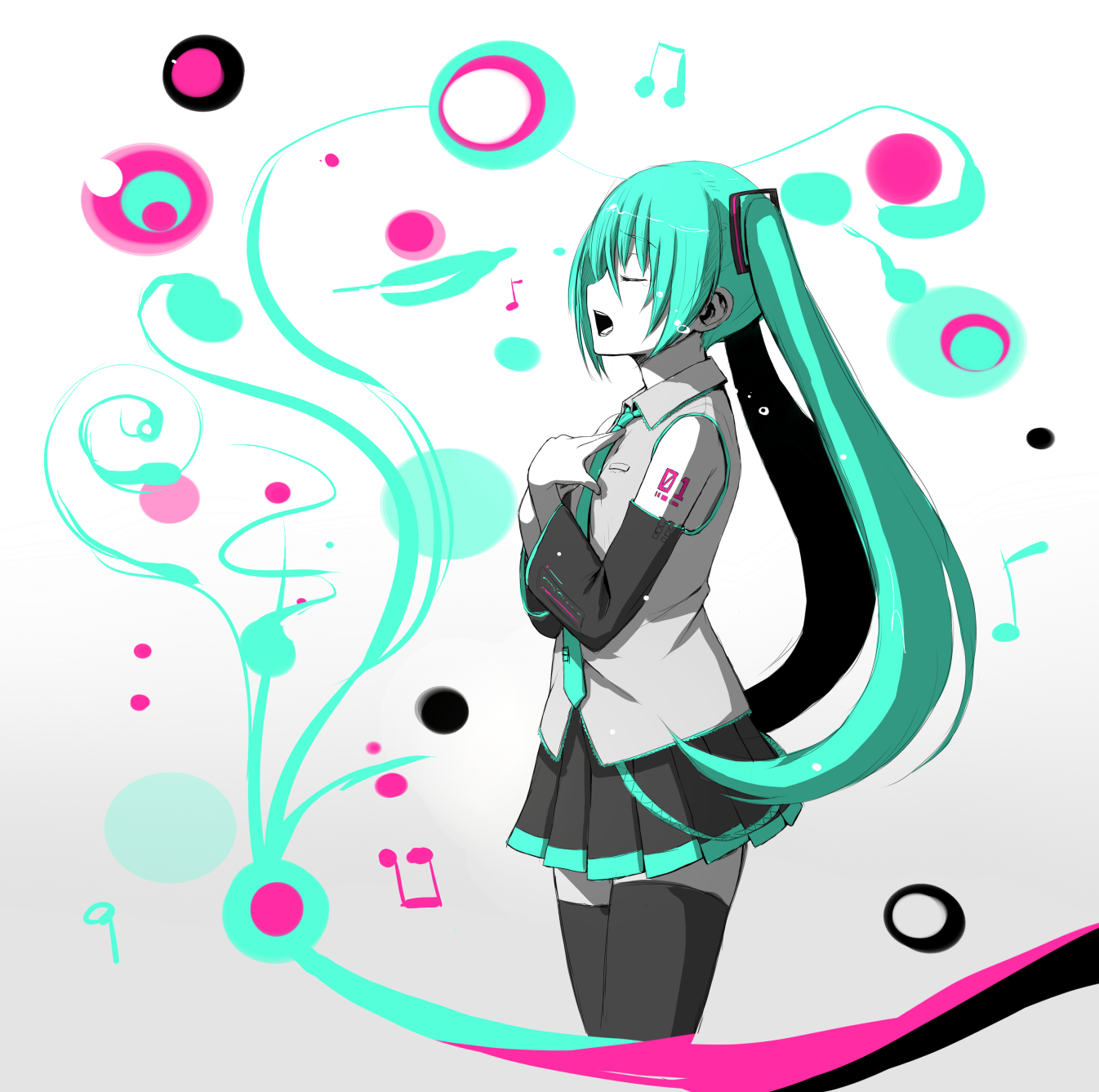 1girlclosed eyesdetached sleevesfemale focusgreen hairlong hairmusicsingingskirtsolothighhighstwintailszettai ryouiki
