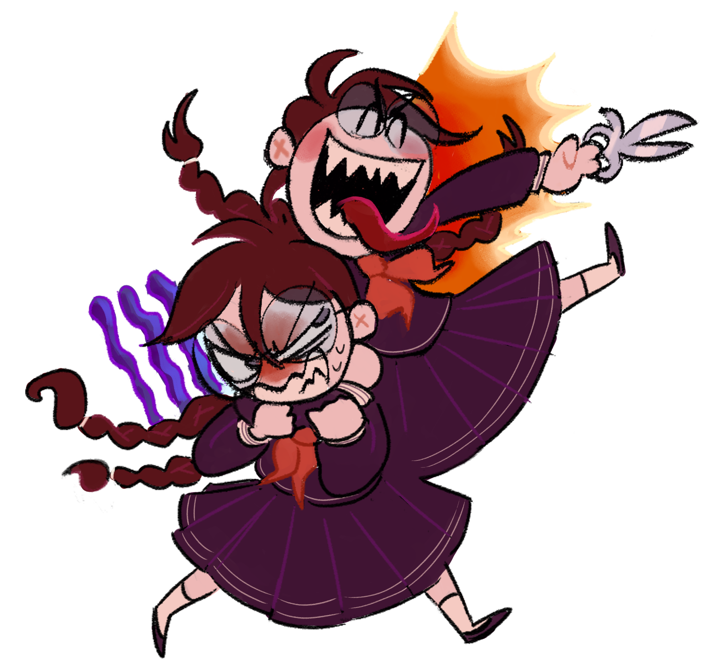 2girlsangryarm around neckblushbraidbrown hairchibichibi onlyclenched teethclosed eyesdual personaglassesholdingholding scissorsholding weaponlong hairlong sleeveslong tonguemultiple girlsneckerchiefopen mouthpurple serafukupurple shirtpurple shoespurple skirtred neckerchiefround eyewearschool uniformscissorsserafukusharp teethshirtshoesskirtskirt setsmilesockssweatteethtonguetongue outtransparent backgroundtwin braidstwintailsv-shaped eyebrowsweaponwhite sockswolfmanritch