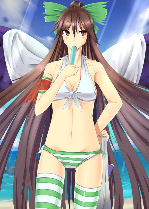 1girlbeachbikinibowbrown hairdayfemale focushand on own hiplong hairnavelorange eyesoutdoorssolostriped bikinistriped clothesstriped thighhighsswimsuitthighhighsvery long hairwings