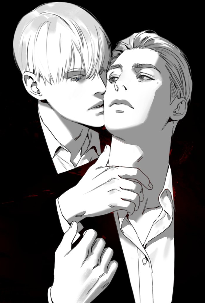 2boysbehind anotherblendingcollared shirtdownturned eyesgreyscale with colored backgroundhair over one eyehair slicked backhand on another's necklipslooking at anotherlooking to the sidemale focusmolemole under eyemultiple boysnoseparted lipsshirtshort hairyaoi