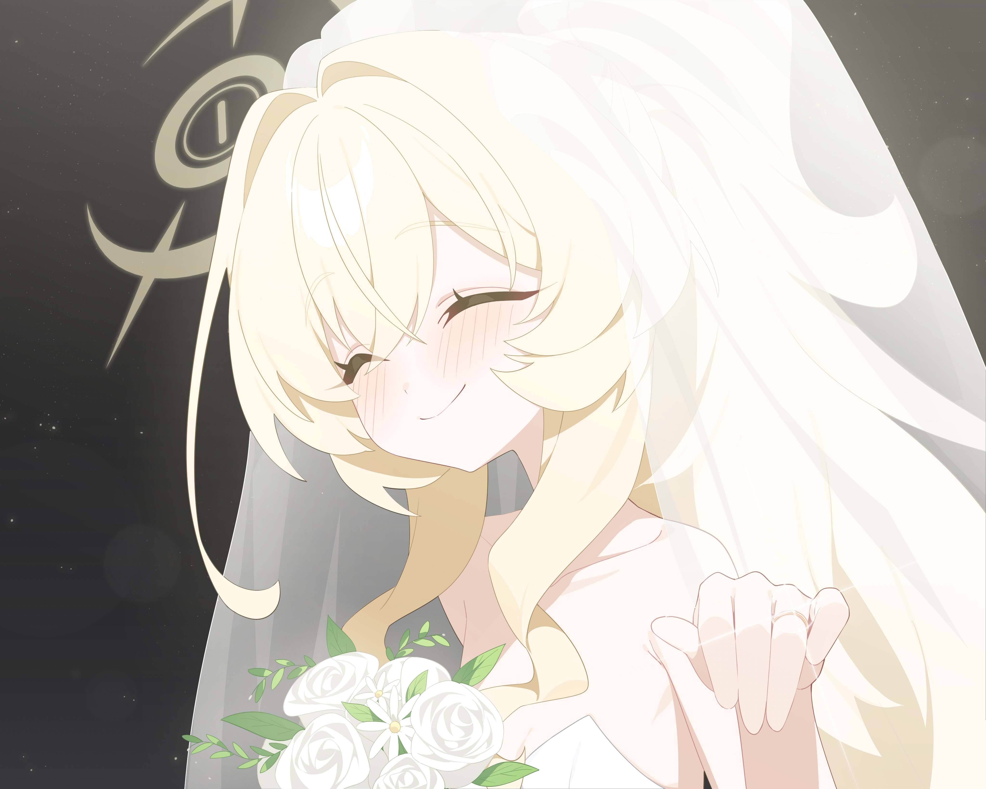 1boy1girlalternate costumebare shouldersblonde hairblushclosed eyesclosed mouthcollarboneflowerhair between eyeshalohand upjewelrylong hairringsoloveilvery long hairwhite flowerwhite veilyellow halo