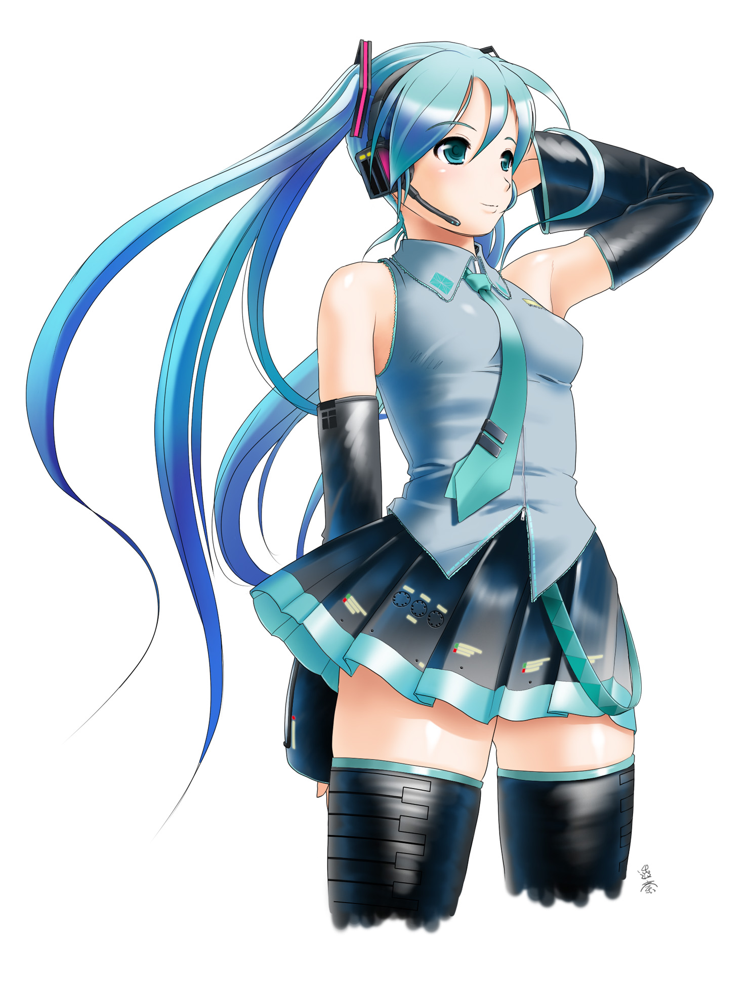 aqua eyesaqua hairdetached sleevesheadphoneslong hairnecktieskirtthighhighstwintailsvery long hairzettai ryouiki