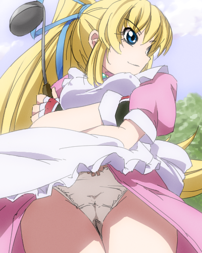 1girlapronblonde hairblue eyescameltoefemale focusladlepantiespantyshotponytailsolounderwearupskirtwhite panties