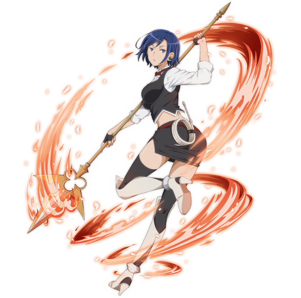 1girlanime coloringbeltblack glovesblack skirtblack thighhighsblack vestblue eyesblue hairbootsbowbowtiebreastscropped vestearringsfingerless glovesfrom behindfull bodyglovesgrey bootshalf glovesholdingholding polearmholding weaponjewelrylooking at viewerlooking backmedium breastsminiskirtofficial alternate costumeparted lipspencil skirtpolearmred beltred bowred bowtieshirtshort hairskirtsolostandingthighhighstwo-handedvestweaponwhipwhite shirt