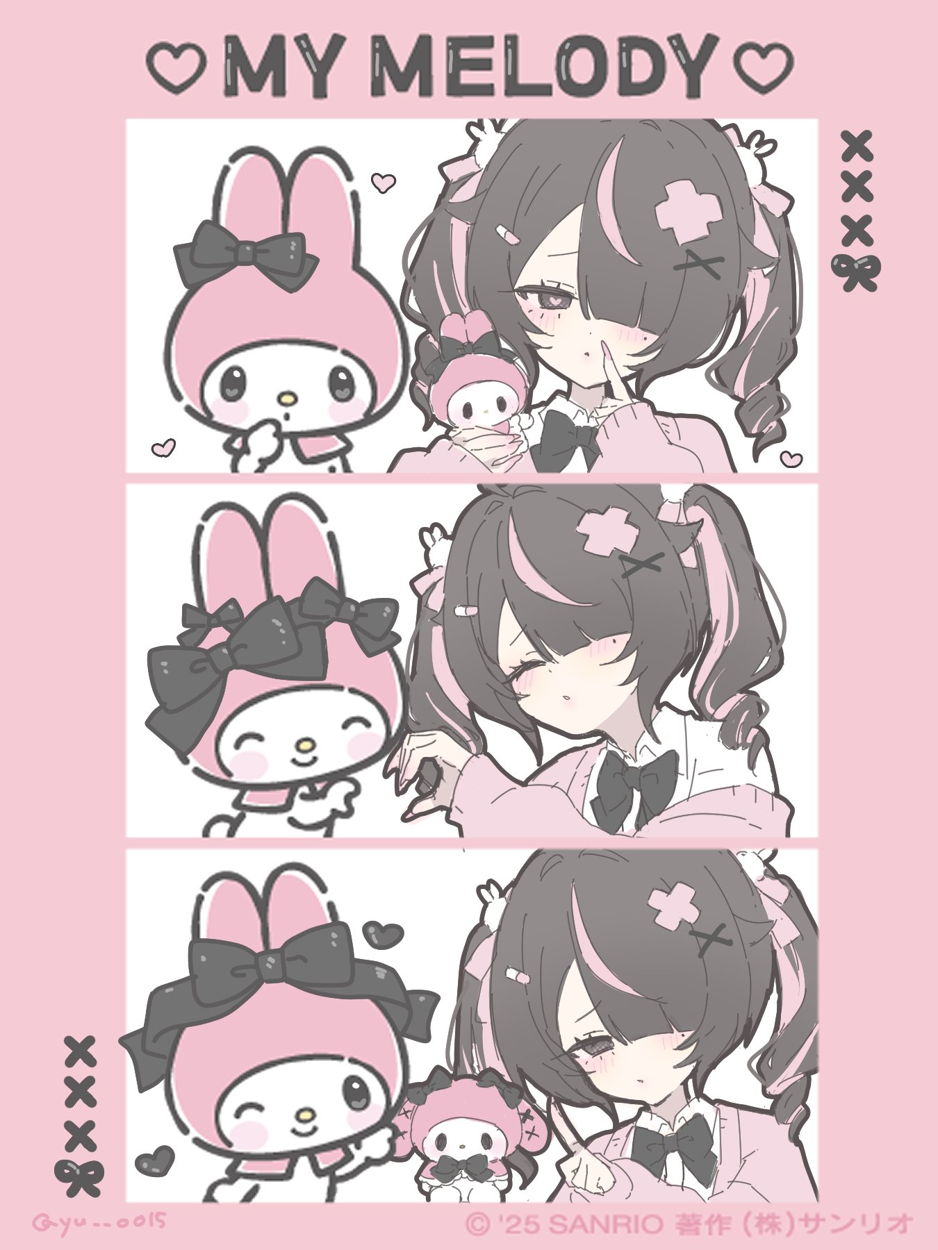 2girlsanimal earsblack bowblack bowtieblack eyesblack hairborderbowbowtiecardiganclosed mouthhair ornamenthair over one eyeheartheart-shaped pupilslong sleeveslooking at viewermedium hairmulticolored hairmultiple girlsone eye coveredparted bangsparted lipspink borderpink cardiganpink streaksrabbit earssmilestreaked hairsymbol-shaped pupilsx hair ornament