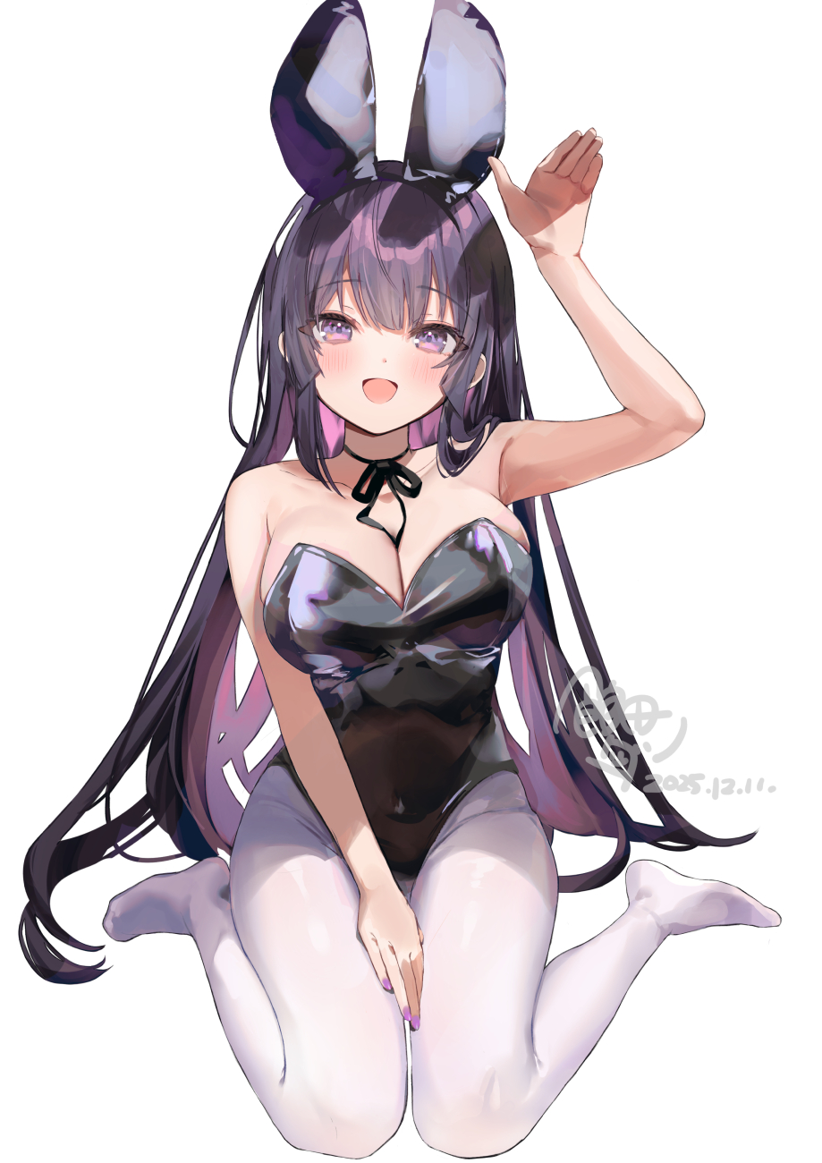 1girlanimal earsblack hairblack leotardblack ribbonbreastscleavagecolored inner hairfake animal earsfull bodyhand uplarge breastsleotardlong hairmulticolored hairneck ribbonno shoesopen mouthpantyhoseplayboy bunnypurple eyespurple hairpurple nailsrabbit earsribbonsmilesolowhite pantyhose