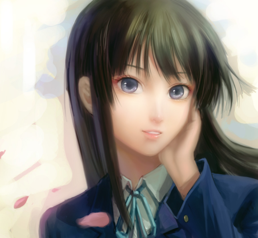 00s1girlblack hairblue eyesfemale focushand on own cheekhand on own facelipslong hairparted lipspetalsportraitrealisticschool uniformsolo