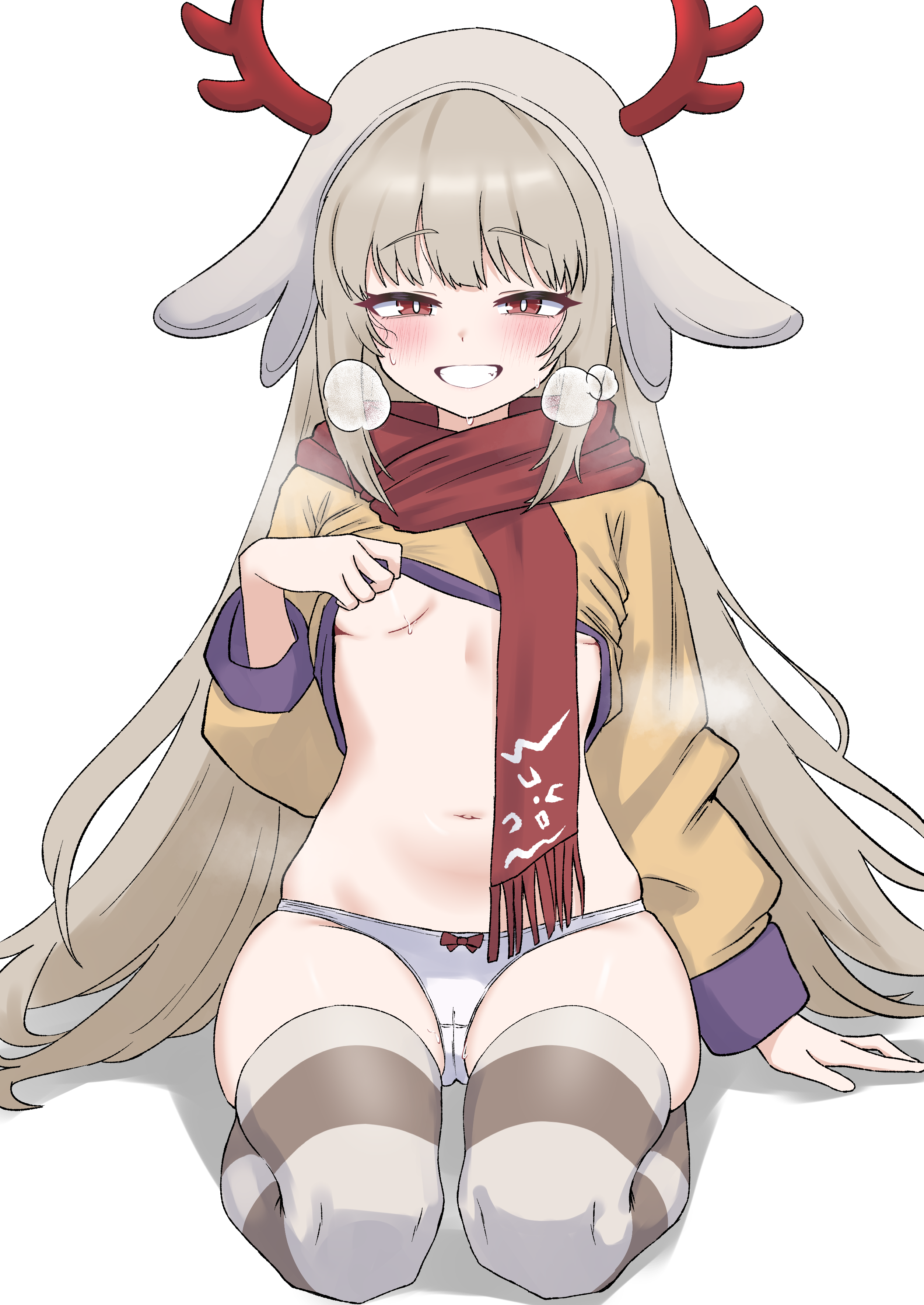 1girlanimal earsantlersbreastscameltoeclothes liftcrotch seamdeer earsfake animal earsfake antlersgrey hairgrinheavy breathinghornslifting own clotheslong hairlooking at viewernavelpantiesred eyesred scarfreindeer antlersscarfseizashirtshirt liftsimple backgroundsittingskindentationsmall breastssmilesolostomachsweatthighhighsunderwearvery long hairwhite backgroundwhite pantieswhite thighhighsyellow shirt