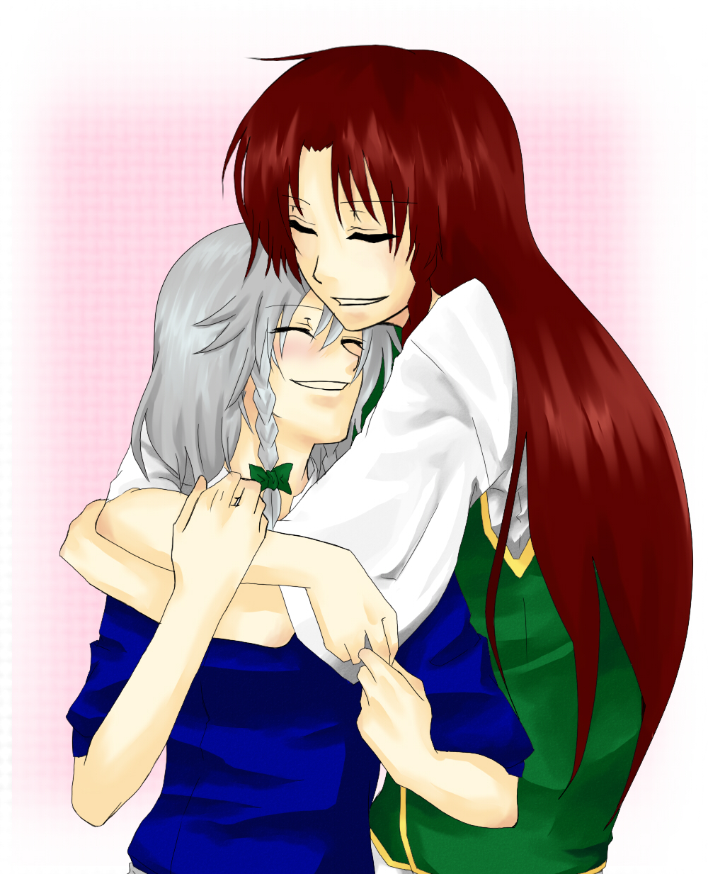 2girlsblushclosed eyesfemale focusgradient backgroundhappyhugmultiple girlssmileupper bodywhite background