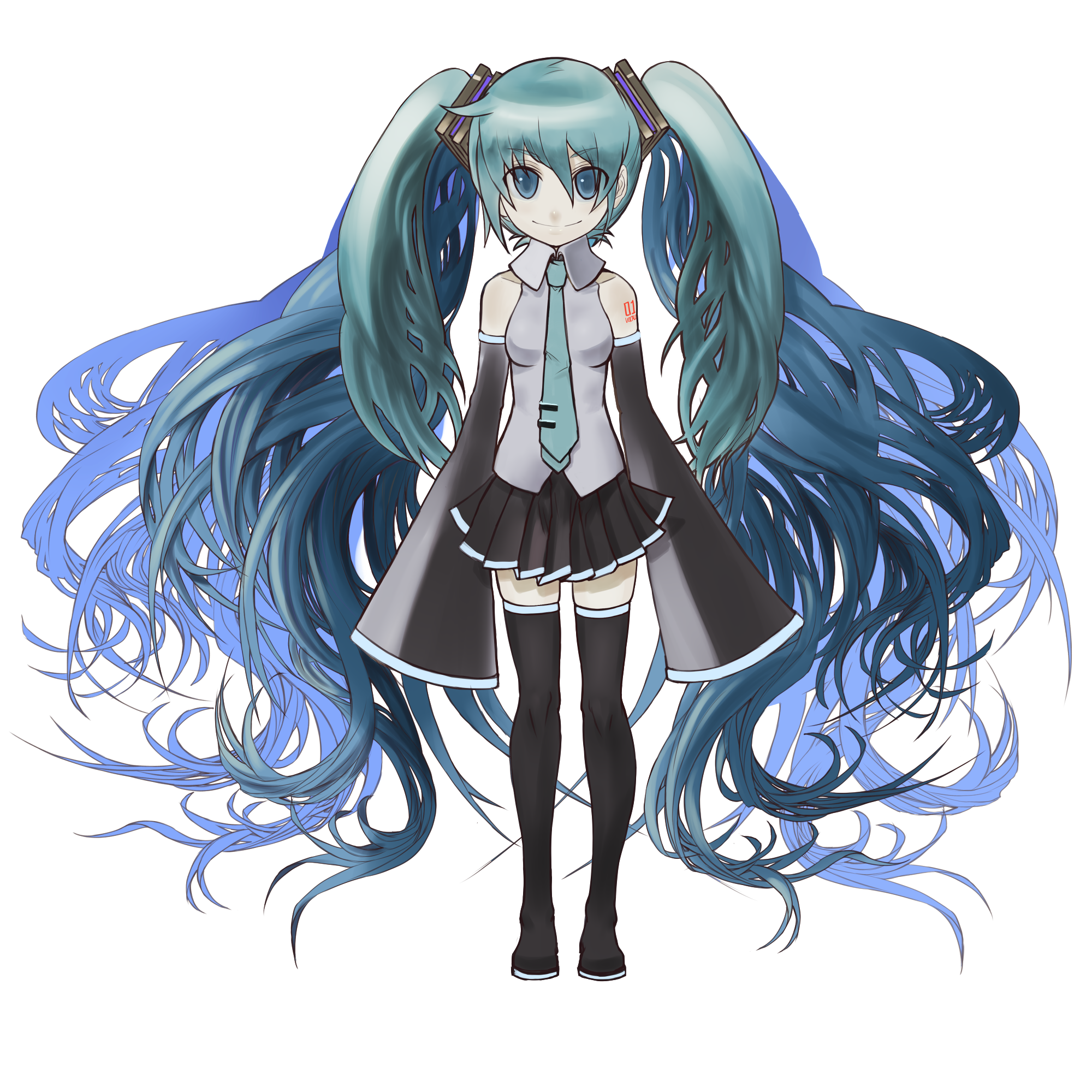 1girlaqua eyesaqua hairdetached sleevesfemale focusfull bodylong hairnecktieskirtsmilesolothighhighstwintailsvery long hairwhite backgroundzettai ryouiki