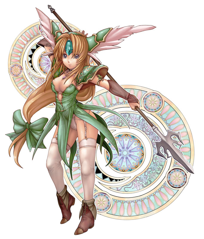 1girlblonde hairbreastsbrown eyescleavagefemale focusgarter strapslong hairlow-tied long hairpantiespantyshotpolearmsolothighhighsunderwearweaponwhite panties