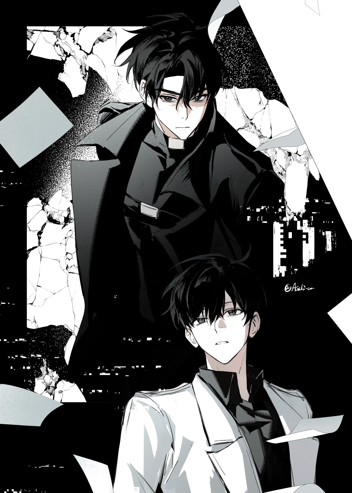 2boysasaki anblack coatblack eyesblack hairblack shirtchest beltcitycoatcollared shirtlooking at viewermale focusmultiple boysnarrowed eyesopen clothesopen coatpopped collarseriousshirtshort hairskystar (sky)starry skywhite coat
