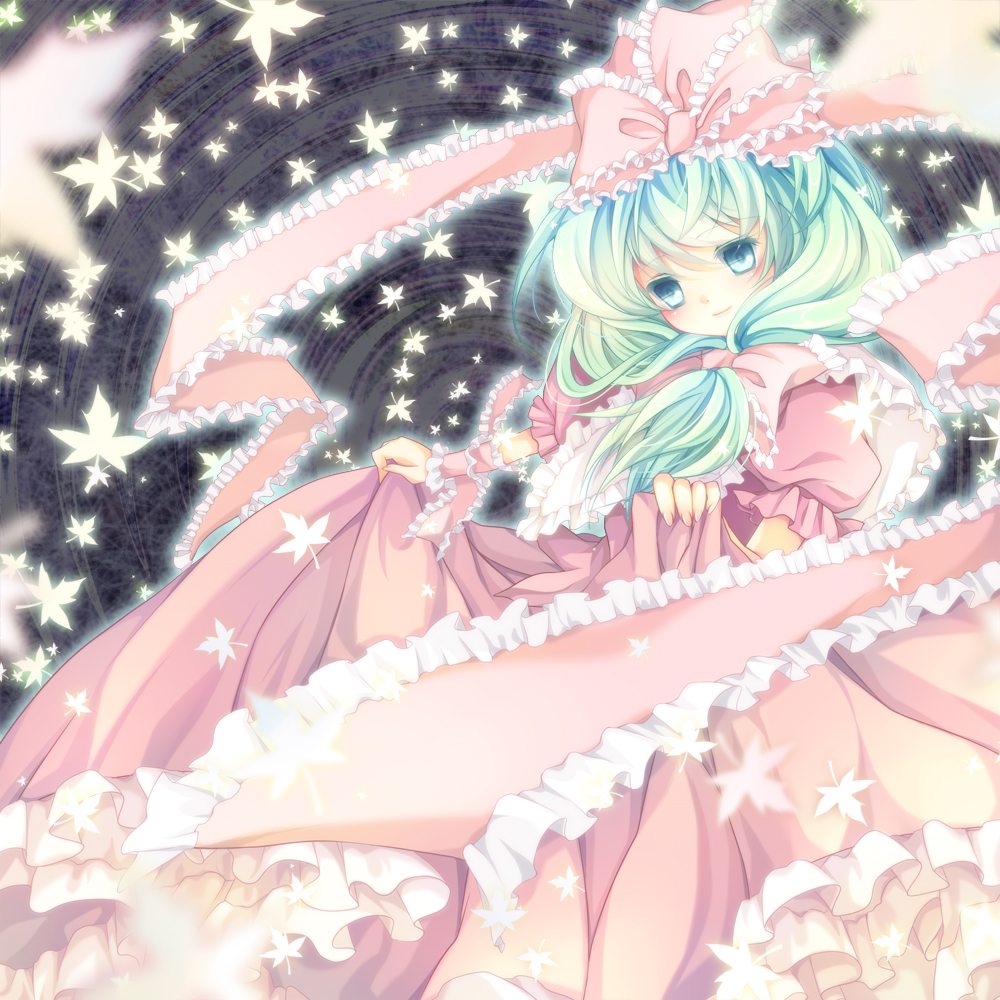 1girlfemale focusfront ponytailgreen eyesgreen hairhair ribbonleafmatching hair/eyesribbonshort hairsolo