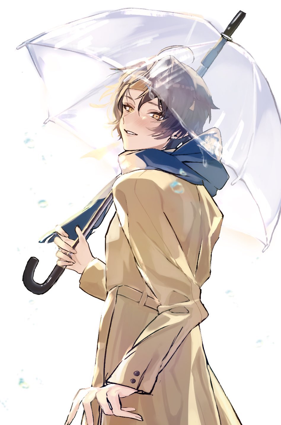 1boyahogealternate costumeblack hairblue scarfbrown coatcoatfrom sideheadbandholdingholding umbrellalimited0twst0slooking at viewermale focusparted lipsrainscarfshort hairsimple backgroundsolotransparenttransparent umbrellaumbrellawater dropwhite backgroundyellow eyesyellow headband