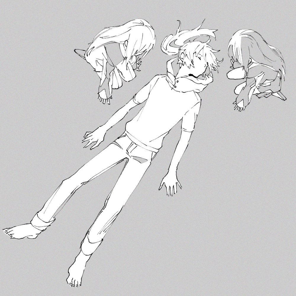 1girl2boysalvis uniformbarefootgrey backgroundgreyscalehooded shirtlong hairlyingminashiro kaguyaminashiro sakuyamonochromemultiple boyson backpantsponytailshort sleevessimple backgroundsittingsketchtrap
