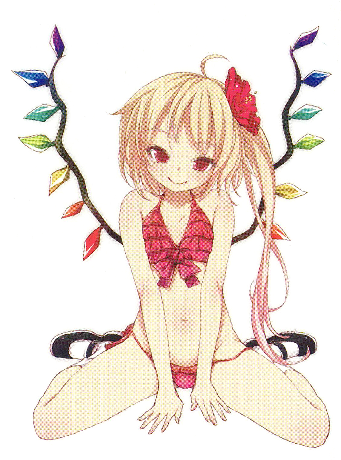 1girlbikiniblack shoesblonde hairfemale focusflat chestfrilled bikinifrillsfront-tie toplooking at viewerloose bikininaughty facepantiesred bikinired eyesshoesside ponytailside-tie bikini bottomside-tie pantiessimple backgroundsittingsolospread legsswimsuitunderwearwariza
