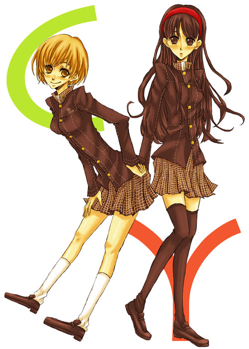 2girlsblack eyesblack hairblushbrown eyesbrown hairhairbandlong hairmultiple girlsschool uniformserafukushort hairskirtsmilethighhighszettai ryouiki