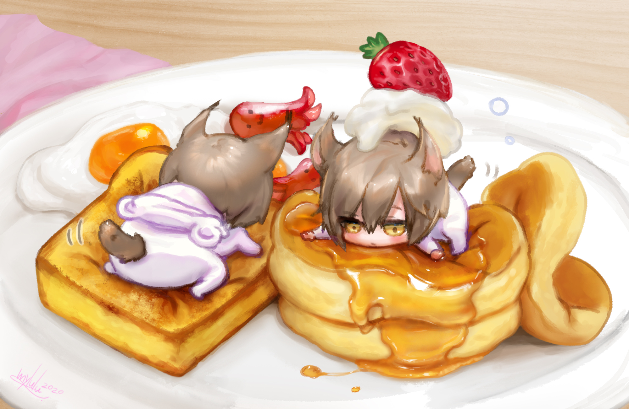 1boyanimal earsanimal hoodbreadbread slicebrown eyesbrown hairchibiclosed mouthfake animal earsfoodfried eggfruithair between eyeshoodhood downin foodmale focusmotion linesmultiple viewsonesiepancakepancake stackplatestrawberrytailtoast