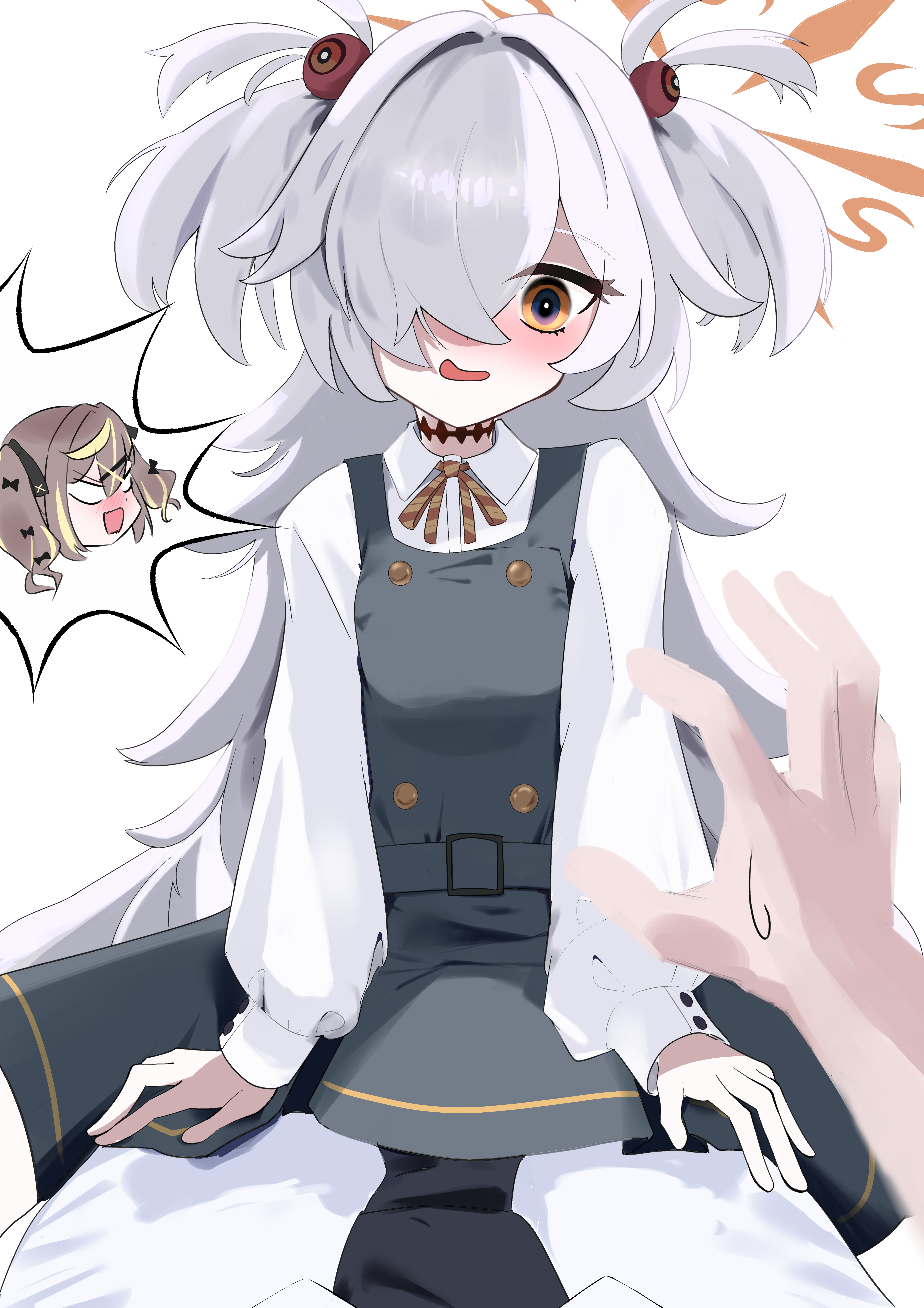 ho'olheyak (arknights), nasti (arknights), arknights, hashtag-only commentary, highres, 2girls, anger vein, aqua wings, breasts, character name, closed eyes, closed mouth, coat, cowboy shot, english text, feathered wings, grey hair, hair between eyes, head wings, horns, long sleeves, lubianshi1, medium hair, multiple girls, open mouth, pointy ears, shirt, small sweatdrop, snake girl, snake tail, speech bubble, standing, tail, teeth, upper teeth only, wings