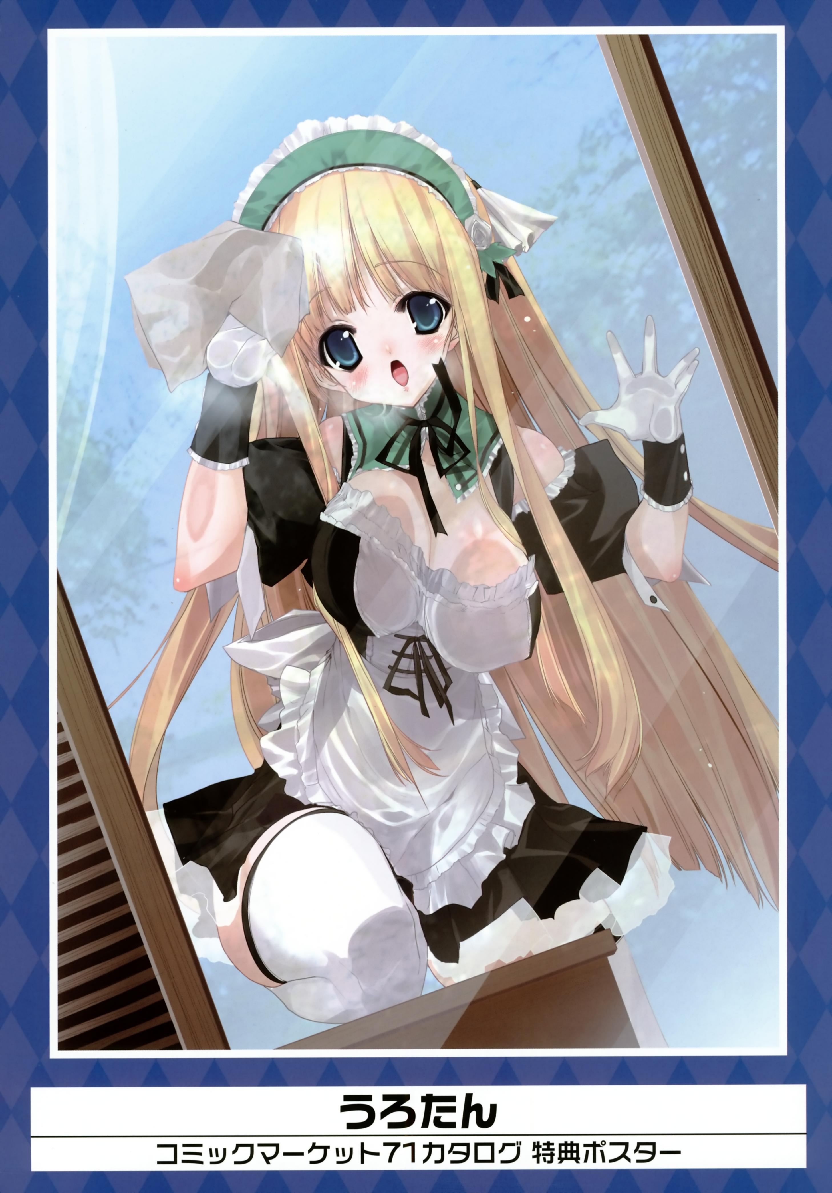 1girlagainst glassblonde hairblushbreast pressbreastsbreasts on glasscleaningcleavagefemale focusglovesgreen eyeshairbandlarge breastsmaidopen mouthsolothighhighswhite gloveswindow