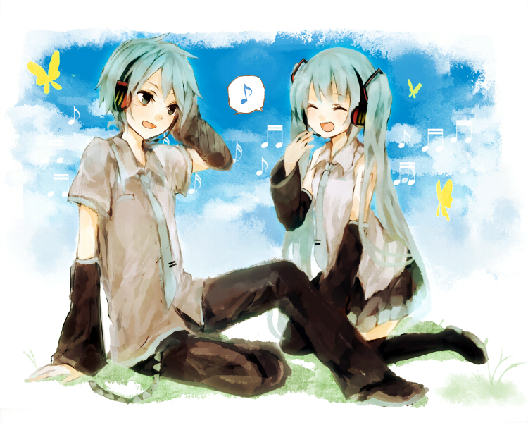 1boy1girlaqua eyesaqua hairbugbutterflydetached sleevesgenderswapgenderswap (ftm)headphonesheadsetlong hairmusical notenecktieopen mouthquavershort hairskirtsmilespeech bubblespoken musical notethighhighstwintails