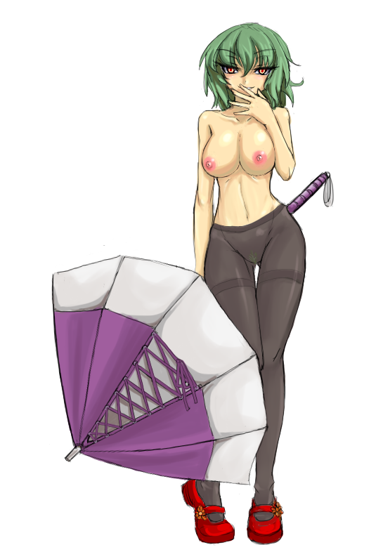 1girlbreastscolored pubic haircontrappostocurvyfemale focusfemale pubic hairgreen hairhand to own mouthlarge breastslegslooking at viewermary janesnarrow waistnavelnipplesno pantiespantyhosepubic hairred eyesseductive smileshoesshort hairsmilesolostandingthigh gapthighband pantyhosetopless femaletsurimeumbrellawide hips