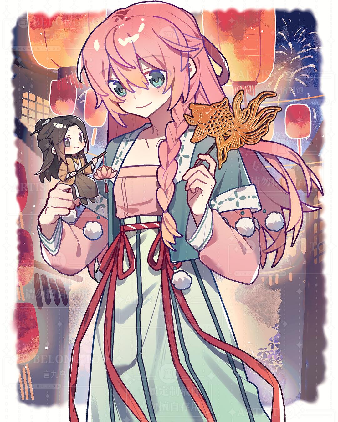 1boy1girlaerial fireworksaqua eyesbeizi (clothing)black eyesblack hairblushbraidchibichinese clotheschinese foodfireworksfoodgreen eyeshanfuholdinglanternlong hairlong sleeveslooking at viewernightpink hairsmiletanghuayiyang yuli