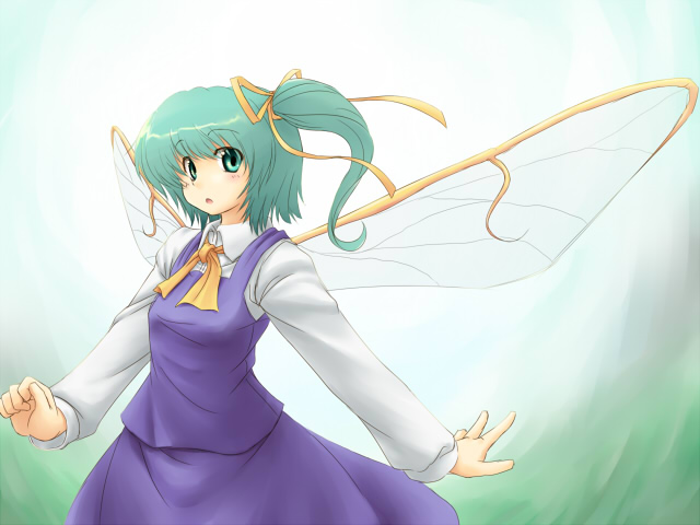 1girlfemale focusgradient backgroundgreen eyesgreen hairhair ribbonoutdoorsplantponytailribbonshort hairside ponytailskysolostandingwhite backgroundwings