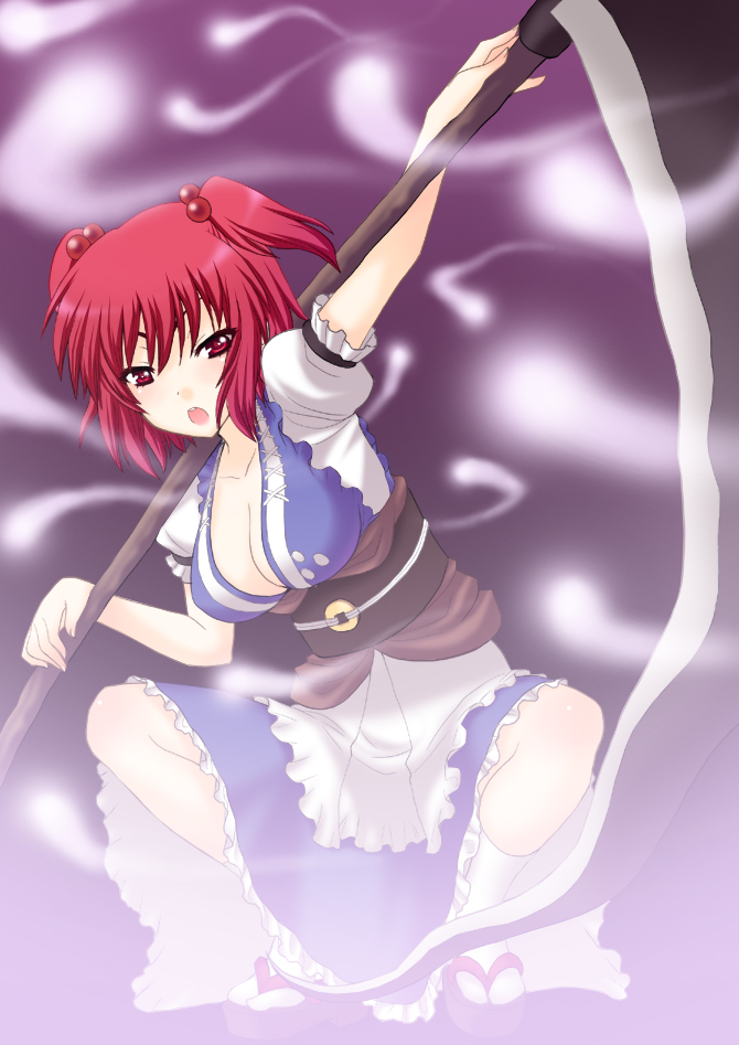 1girlbreastscleavagedressfemale focusfull bodygradient backgroundhair bobbleshair ornamentlarge breastsred eyesred hairscytheshort hairsolosquattingtwintailstwo side up