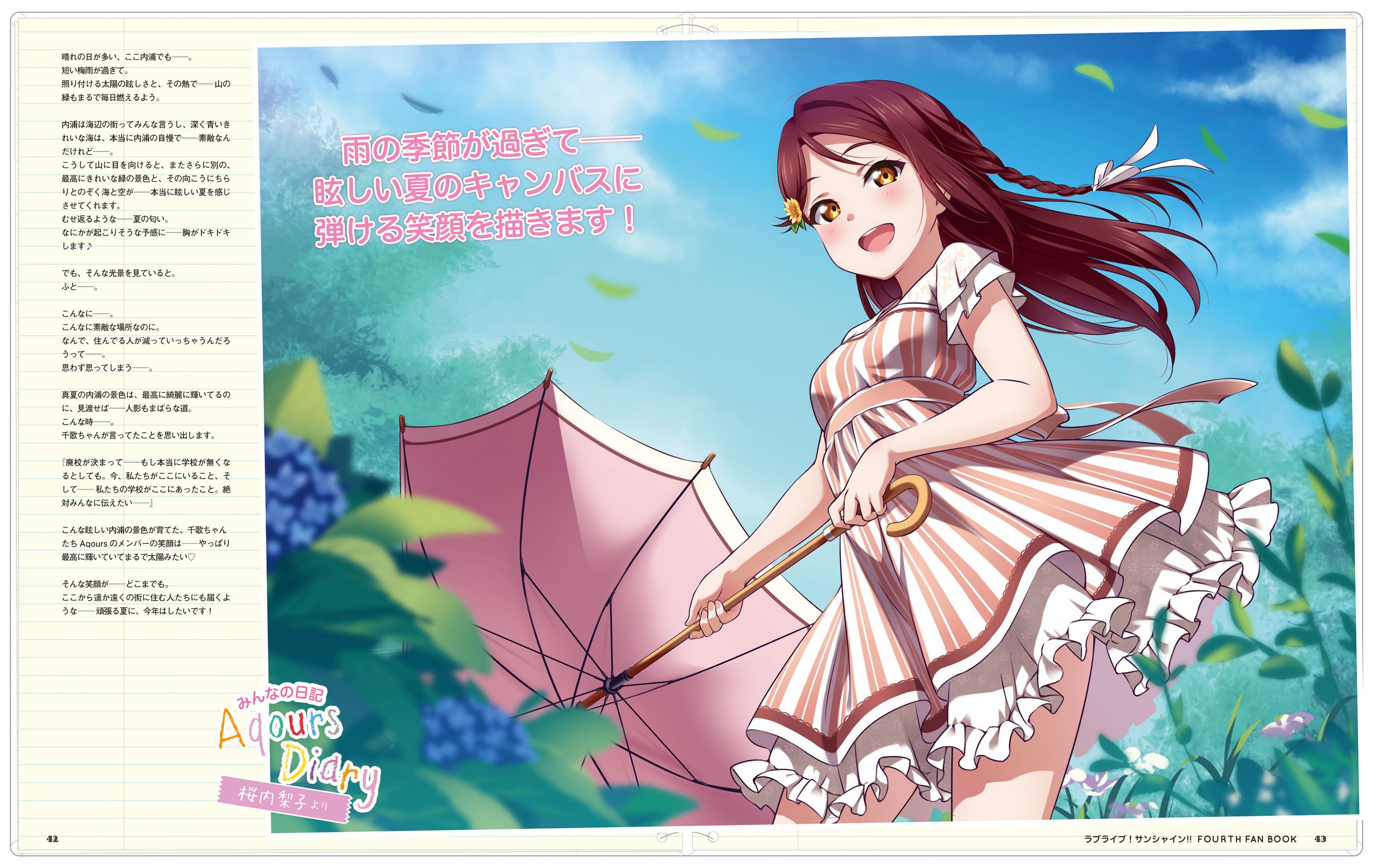 braidclouddressflowerhair flowerhair ornamentjapanese textlong hairopen mouthoutdoorsred hairside braidskysmilestandingumbrellawindyellow eyes