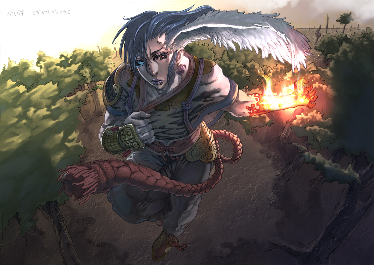 00s1boyarmorblue hairdutch angleearringsfeathersfireforeshorteningforesthead wingsjewelrymale focusmuscularnaturepersonificationsolotattoowings