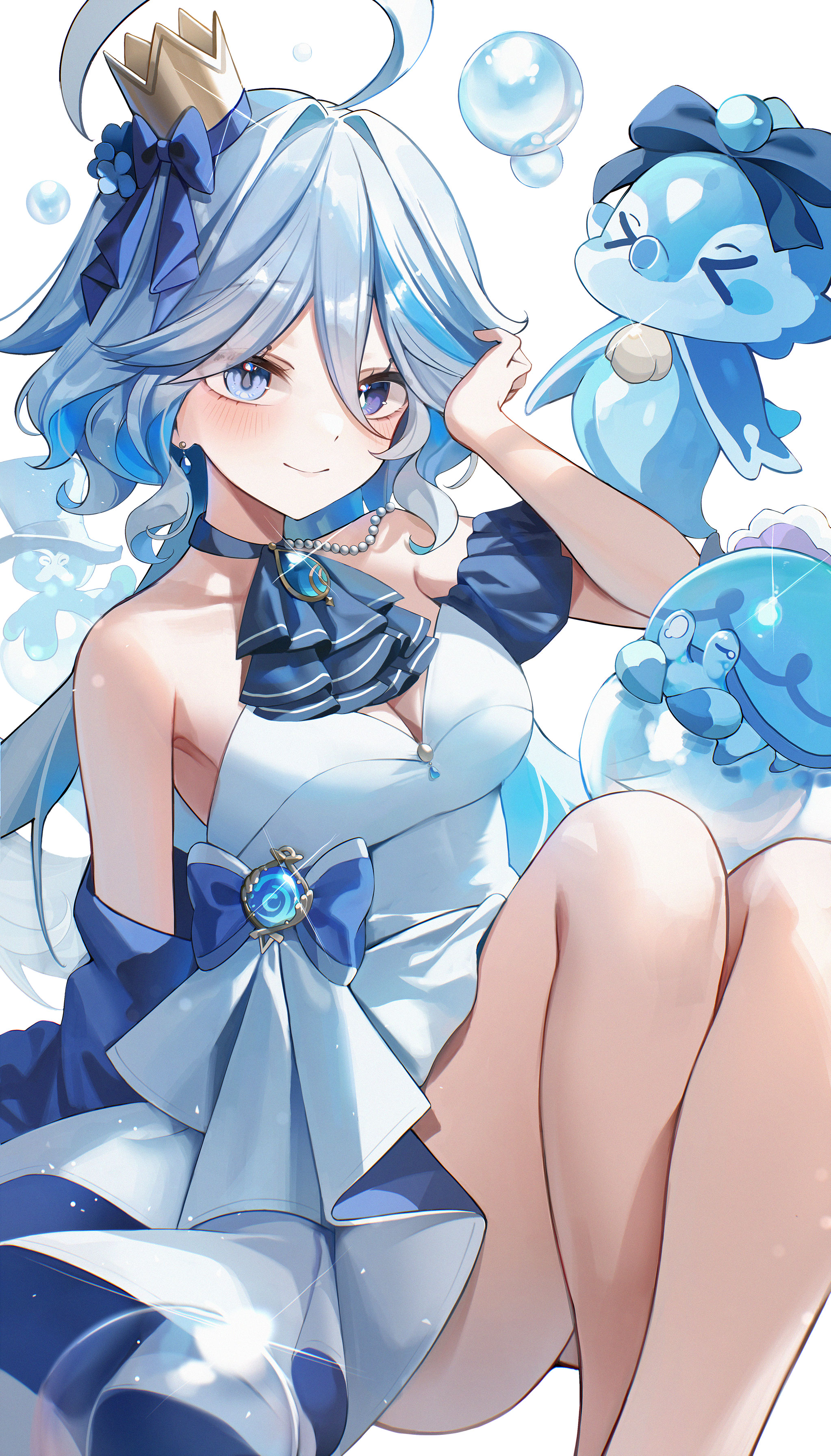 1girlalternate costumeascotblue ascotblue eyesblue gemstoneblue hairblushbreastsbroochcowlickcrowndressdrop-shaped pupilsearringsgemheterochromiajewelryknees uplong hairmedium breastsmini crownsimple backgroundsmilesolosymbol-shaped pupilswhite backgroundwhite dress