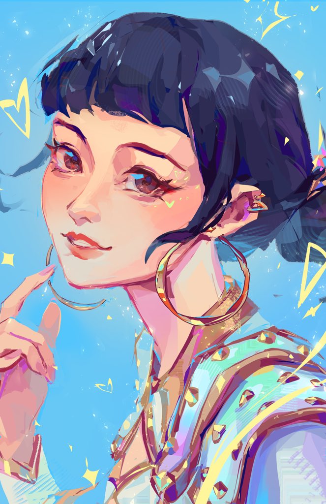 1girlblack hairblue backgroundbrown eyesdouble bunearringseyelinerhair bunhearthoop earringsjeunnyjewelrylong sleevesmakeupmascarapink nailsprofilepurple nailsshort bangssidelockssimple backgroundsmilesolosparkle