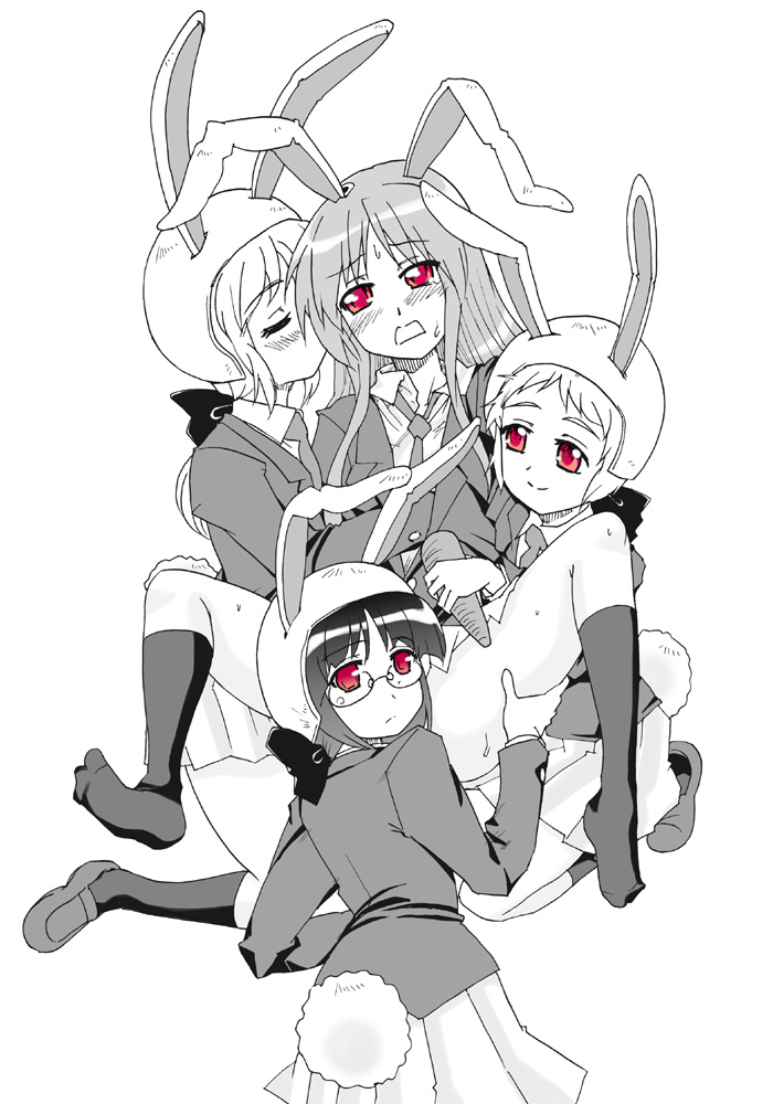 4girlsanimal earsblazerblushcarrotfemale focusgreyscalejacketkneehighslong hairmonochromemultiple girlsnecktiepleated skirtrabbit earsrabbit tailred eyesshort hairskirtsocksspot colortailyuri