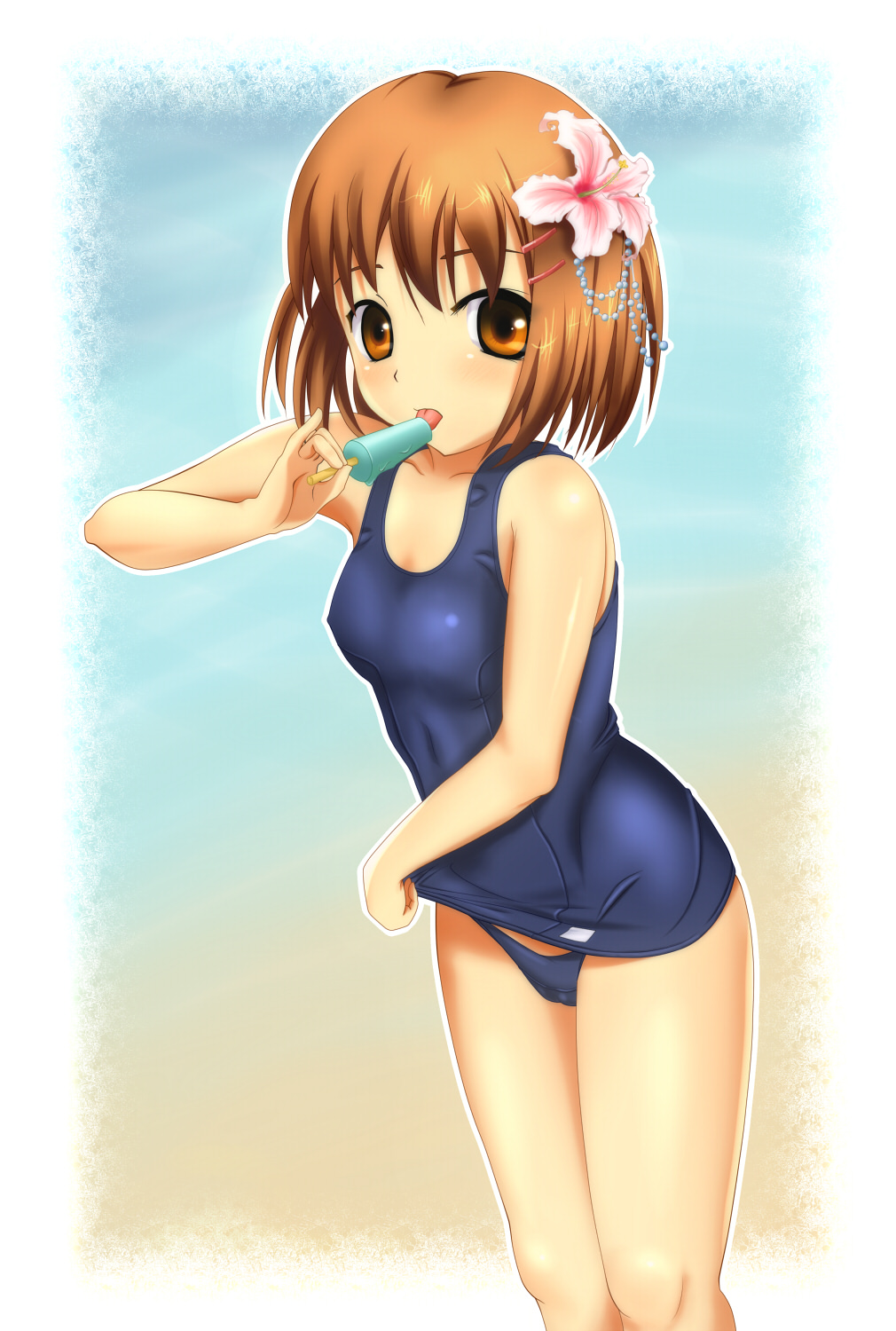 1girlbrown eyesbrown hairclothes pullfemale focusflowerfoodhair ornamenthaircliphibiscusone-piece swimsuitone-piece swimsuit pullpopsicleschool swimsuitsoloswimsuit