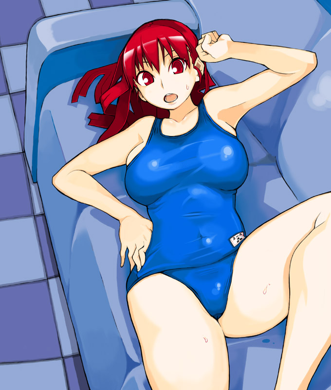 1girlarmpitsbreastscouchfemale focuslarge breastslyingone-piece swimsuitred eyesred hairschool swimsuitsoloswimsuit