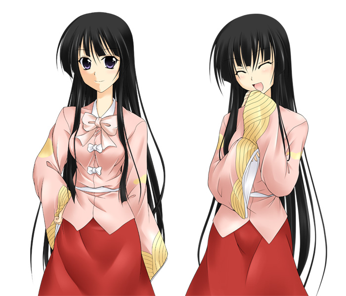 1boy1girlblack eyesblack hairblunt bangsclosed eyesfemale focushand on own hiphip focusjapanese clotheslong hairlong sleevesmultiple viewssimple backgroundskirtwhite background