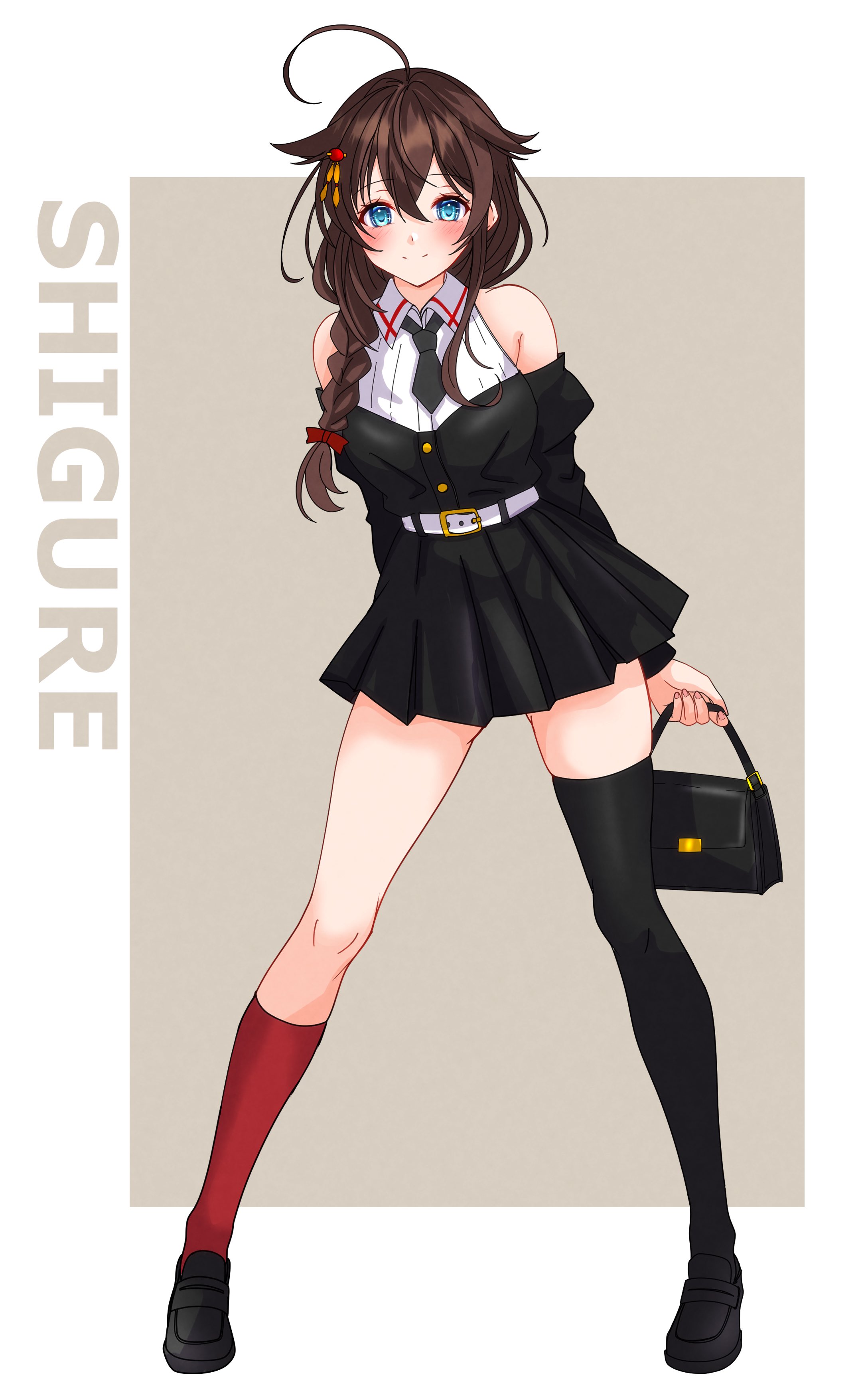 1girlahogeasymmetrical legwearbagbeltblack necktieblack shoesblack skirtblack thighhighsblue eyesblushborderbraidbreastsbrown haircharacter namedetached sleevesfull bodygrey backgroundhair between eyeshair flapshair ornamenthair over shoulderholdingholding baglong hairlooking at viewernecktieofficial alternate costumeshigure (yokosuka) (kancolle)shoessimple backgroundsingle braidsingle thighhighskirtsmilesolothighhighsthighswhite beltwhite border