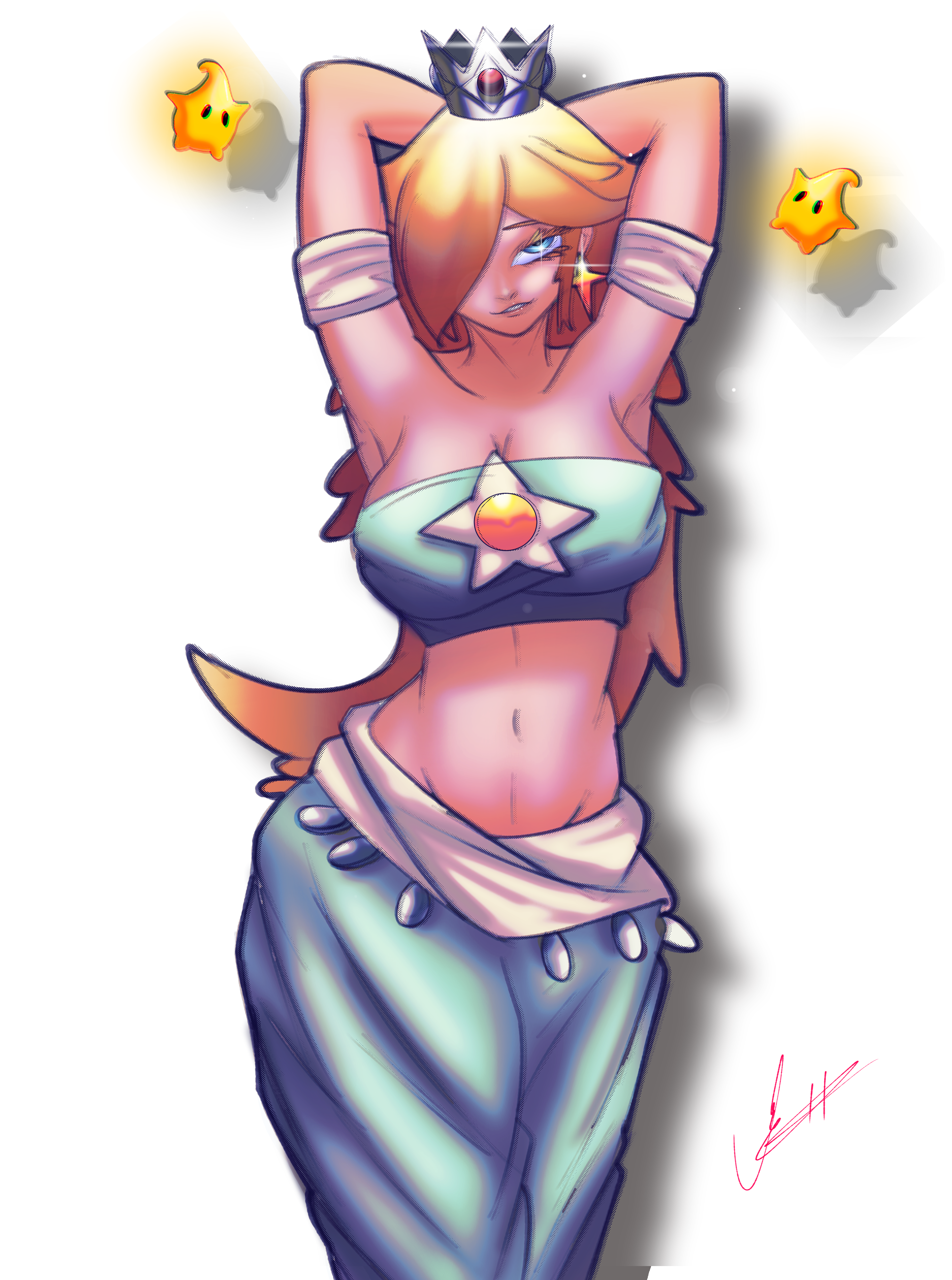 1girlarabian clothesarmpitsarms behind headartist namebelly dancerblonde hairbreastscleavagecurvyhair over one eyelarge breastslong hairmidriffnavelparted lipsseductive gazeseductive smilesmilestraplessteethtonedtube top