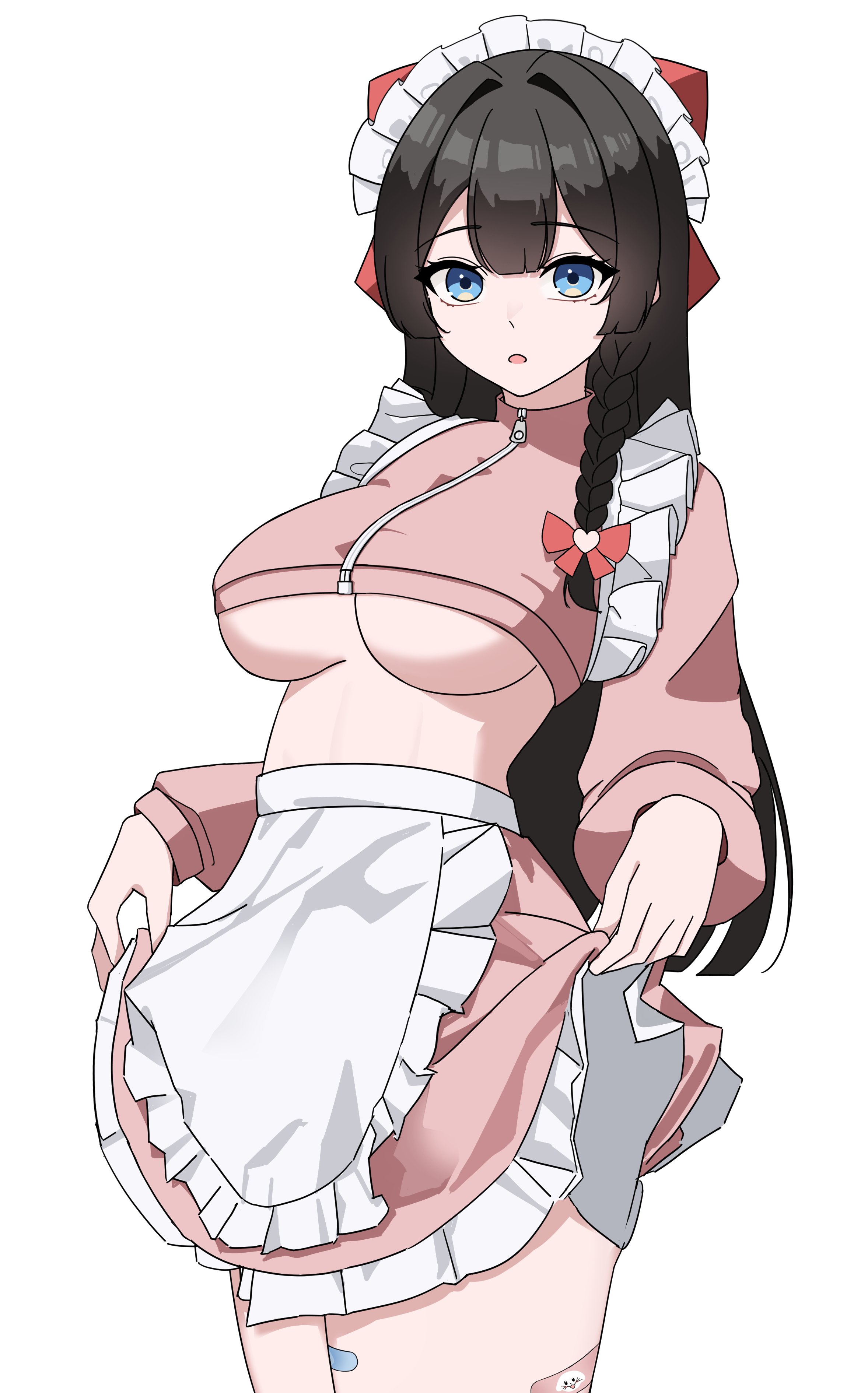 1girlapronarms at sidesbandaidbandaid on legblack hairblue eyesbowbreastsclothes liftcowboy shotcrop topcropped jacketdouble-parted bangsfrilled jacketfrillshair bowhair intakesishi bap burgerjacketlarge breastslifting own clotheslong hairlooking at viewermaid headdressno braparted lipspink jacketpink skirtred bowsimple backgroundskirtskirt liftsolostandingunderboobvirtual youtuberwaist apronwhite apronwhite backgroundzipper pull tab