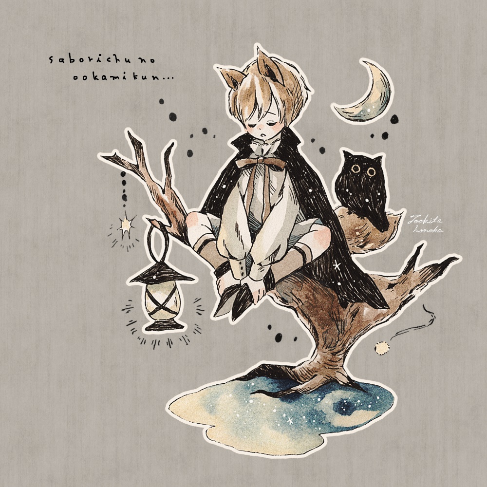 1boyanimal earsartist namebare treebirdblack capeblack shoesbrown ribboncapeclosed mouthcrescent moondot nosefull bodygrey backgroundgrey shortsgrey sockshands on own feetlanternlong sleevesmale focusmoonneck ribbonoutlineowlparted lipsribbonshirtshoesshortssignaturesimple backgroundsittingsockssolotailtookita honokatreewhite outlinewhite shirtwolf boywolf earswolf tail