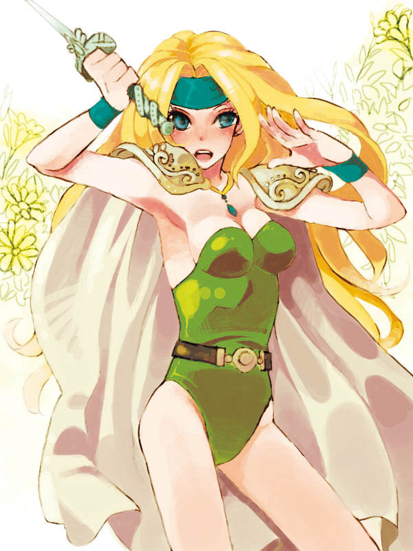 :o1990s (style)1girlarmorarmpitsbeltbelt skirtblonde hairblue eyesblushbreastscapecleavagecontrappostocowboy shotelbow glovesfemale focusfloral backgroundflowergloveshands upholdingholding swordholding weaponjewelrylegs apartleotardlong hairlooking at viewernecklaceopen mouthpauldronspendantretro artstyleshoulder armorsideboobsolostandingstraplessstrapless leotardswordvery long hairweaponwristband