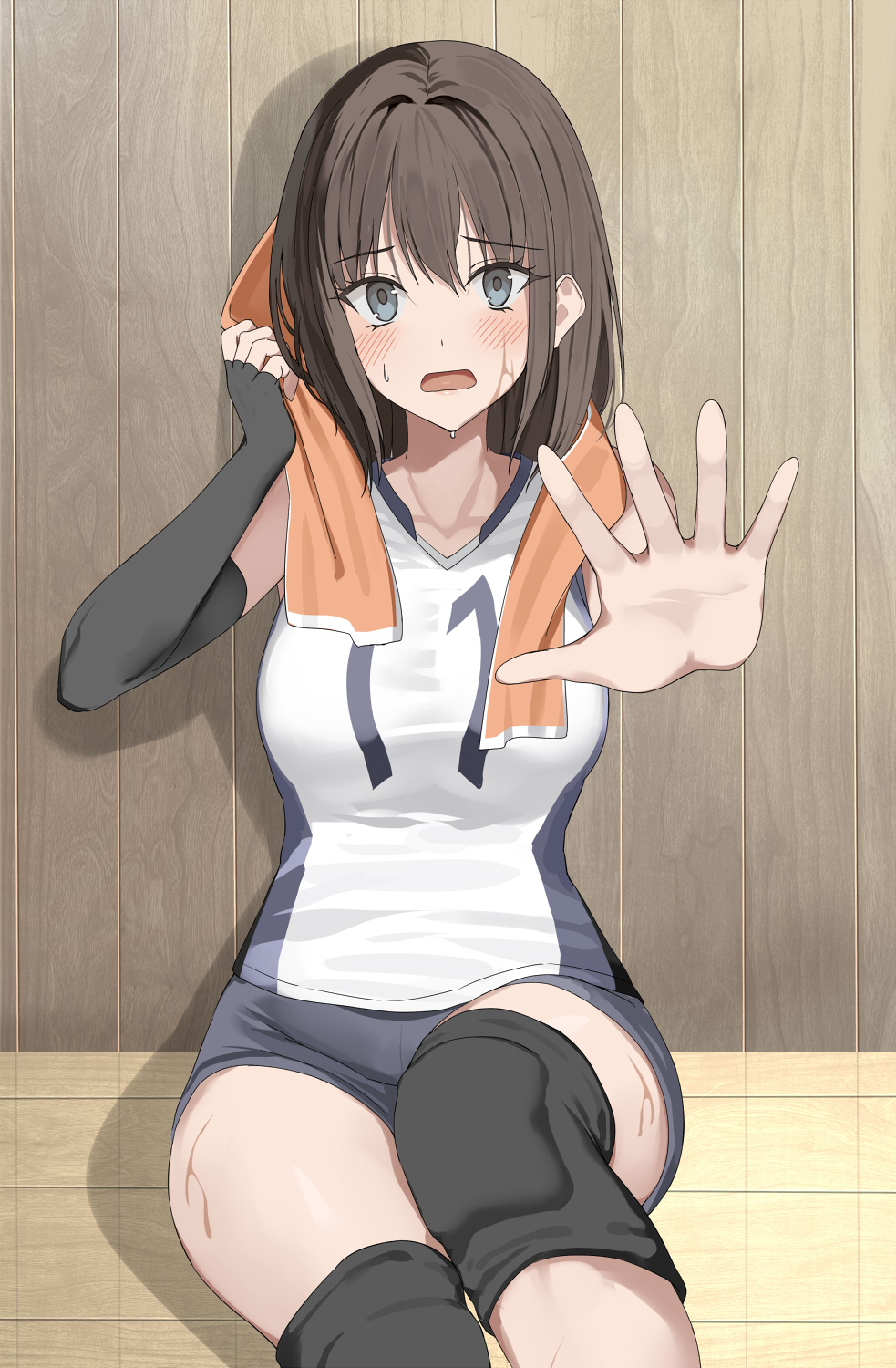 1girlblack shortsblack sleevesblue eyesblushbreastsbrown haircollarboneelbow sleeveembarrassedhair between eyesjerseyknee padslong hairlooking at viewermedium breastsopen mouthoutstretched armshortssingle sleevesleevelesssolosportswearsweatvolleyball uniformwhite jersey