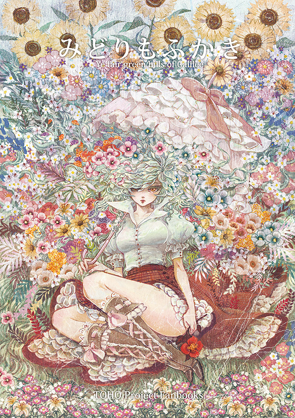 1girlblousebootsbowcoverdressdress shirteyelashesfemale focusfieldflowerflower fieldfrillsgreen hairhair over one eyelace-up bootsparasolpetticoatplaid clothesplaid skirtred eyesshirtshort hairskirtsolosunflowersunflower fieldtaut clothestaut shirtumbrella