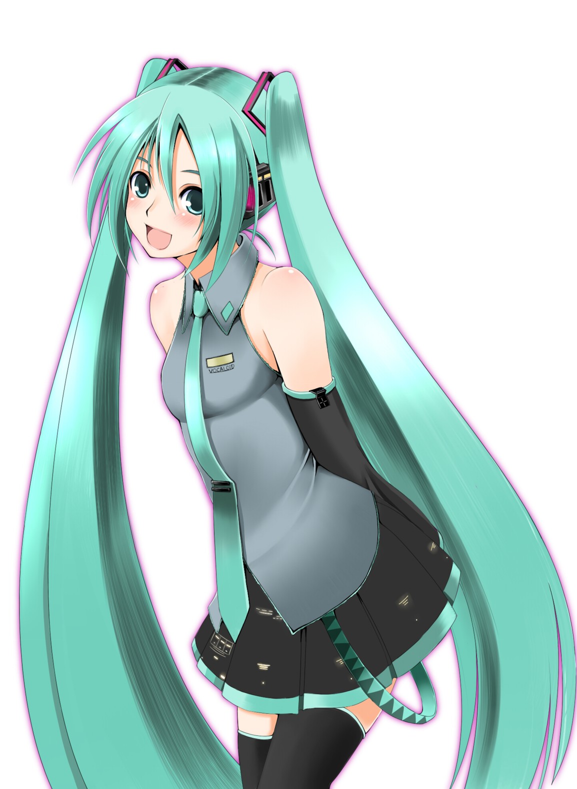 aqua eyesaqua hairblushdetached sleevesheadphoneslong hairnecktieskirtsmilesolothighhighstwintailsvery long hair