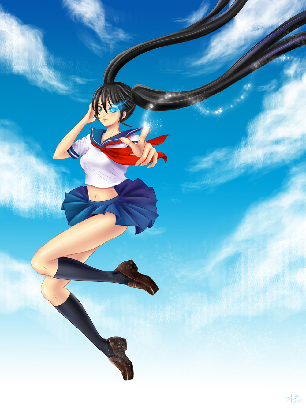 10s1girlblack hairblue eyesclouddayfemale focusglowingglowing eyeglowing eyeslong hairmidriffschool uniformskysmilesolotwintailsvery long hair