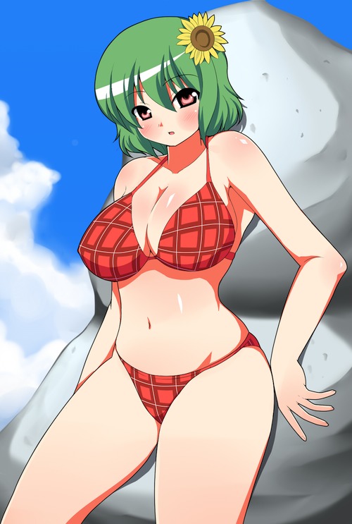 1girlbikiniblushbreastscleavagecloudcurvydayfemale focusflowergreen hairhair flowerhair ornamentlarge breastsplaid bikiniplaid clothesred bikinired eyesshort hairskysolosunflowerswimsuit