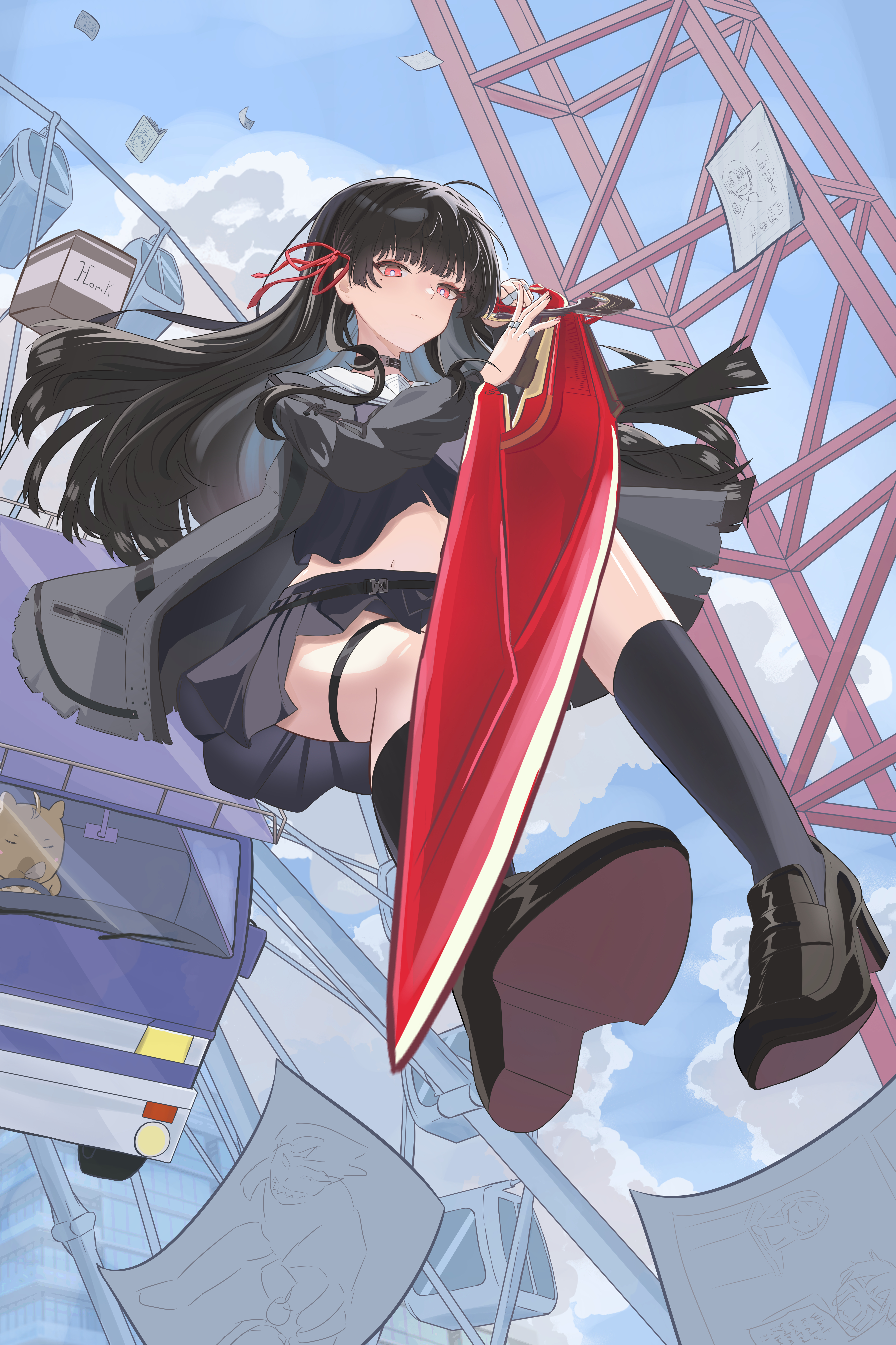 1girlblack chokerblack hairblack jacketblack shirtblack shoesblack skirtbright pupilschokerclosed mouthdayhair ribbonholdingholding swordholding weaponjacketlong hairlong sleevesmolemole under eyenamipon (wuthering waves)red eyesred ribbonribbonsailor collarshirtshoesskirtswordthigh strapweaponwhite pupilswhite sailor collar