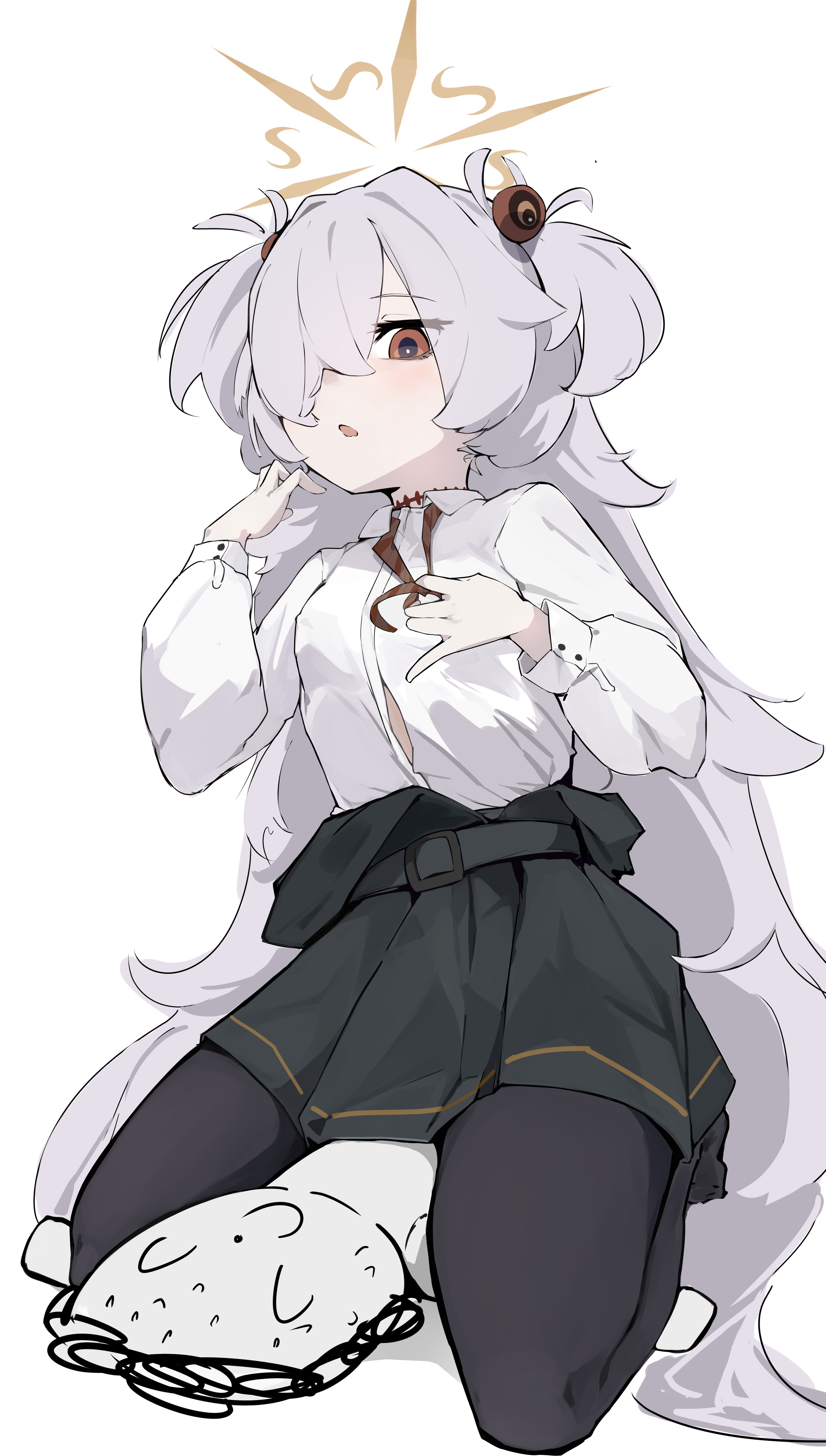 1boy1girlbeltblack dressblack pantyhoseblushbreastsbrown eyesbrown ribbonbutton gapclothes pullcollared shirtdressdress pullgrey hairhair over one eyehalohand upkneelinglong hairlong sleeveslooking at viewerneck ribbonno shoesone eye coveredpantyhoseparted lipspinafore dresspleated dressribbonscarscar on neckshirtsimple backgroundsleevelesssleeveless dresssmall breastssolo focusstriped ribbontwo side upundone neck ribbonvery long hairwhite backgroundwhite shirtyellow halo