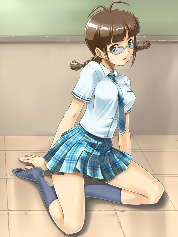 00s1girlantenna hairbraidbreastsbrown eyesbrown hairfemale focusfull bodyglassesindoorskneehighskneelingnecktieplaid clothesplaid skirtrough time schoolschool uniformshort hairskirtsockssolotwin braids